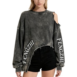 סגנון חדש מוגז בציר שטוף כתף קר רקום לוגו רקומים מושלכת pullover אפור נשים