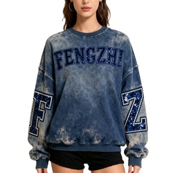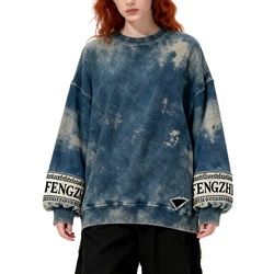 אופנתית סתיו הבציר נשטף מודפס לוגו סימטרי במצוקה שולי כחול עניבה כחול צבע סווטשרט Pullover לנשים