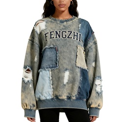 नए आगमन शरद ऋतु रेट्रो डेनिम पैचवर्क व्यथित कढ़ाई लोगो चालक दल गर्दन लंबी आस्तीन नीले पल्लोवर स्वेटशर्ट महिलाओं के लिए