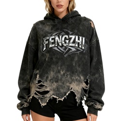 Trendy Autumn Grunge Street Vintage Distressed Hooded Acid Wash Printed Logo Cotton Drop Shoulder Long Sleeve Hoodie for Women