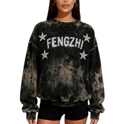 Chic Autumn Sparkly Streetwear Vintage Rhinestone Star Logo Acid Wash Comfortable Cotton Pullover Sweatshirt for Women