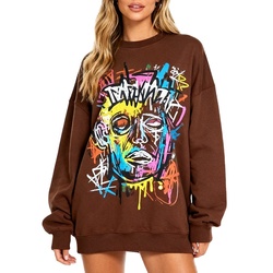 OEM 가을 새로운 스타일 낙서 예술 인쇄 부드러운 패브릭 승무원 목 긴 소매 다크 브라운 풀오버 까마귀 운동복 여성용
