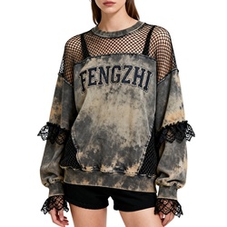 Şık sonbahar Retro Streetwear sıkıntılı Mesh dantel Patchwork asit yıkama baskılı Logo yumuşak pamuklu kazak kadınlar için kazak