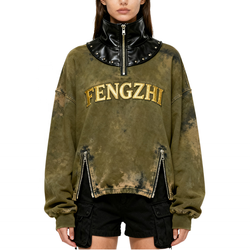 Trendy sonbahar Punk sokak deri çivili yüksek boyun asit yıkama kadınlar için işlemeli Logo pamuk fermuar Hem kazak kazak